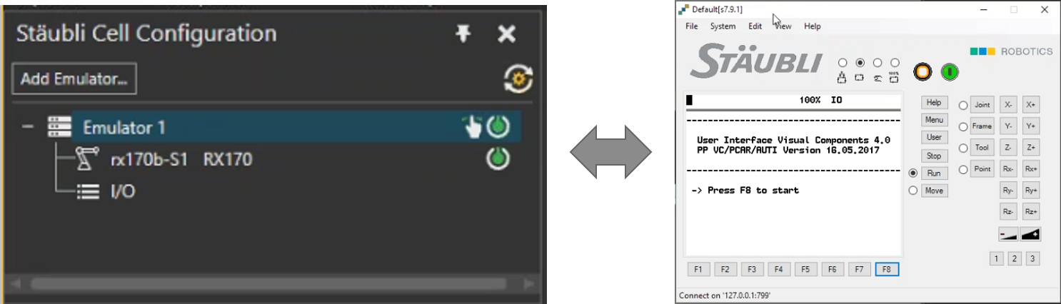 Stäubli robot connection add-on supports creating/editing robot program positions and running them with a Stäubli controller to verify program operation and cycle times. Add-on also supports positional data transfer between a simulated and real controller.