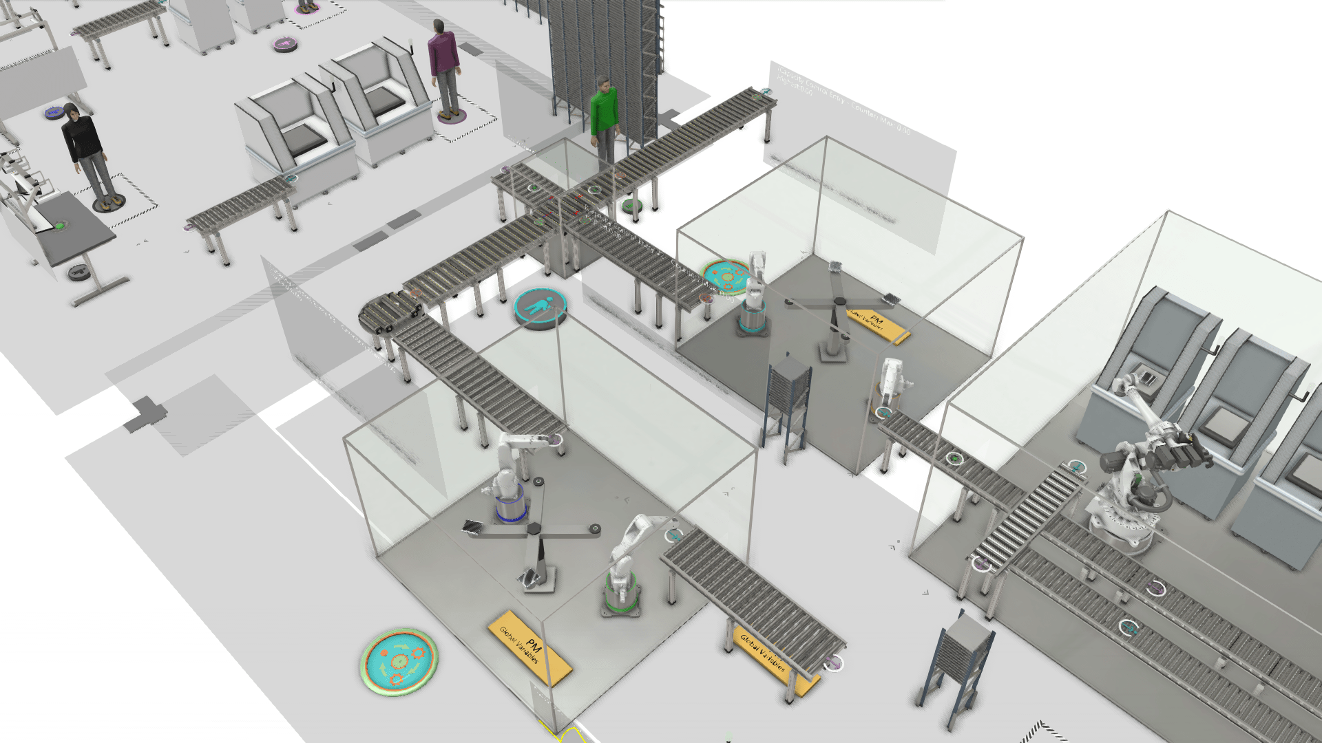 To de-risk the change, Jaroslav turned to simulation. Using Visual Components’ 3D manufacturing simulation platform, he built a detailed digital twin of the entire HTR#2 leak testing line: the conveyors, testing machines, capacity sensors, and logic of the leak test line. Almost every aspect of the current process was modeled: the different heater exchanger variants, their arrival rates, the cycle times of each leak test, and even the operator interactions for loading and unloading. By reproducing the line virtually, the team could experiment with the new “smart distributor” logic in a safe environment, observing how the system would behave without disrupting actual production.
