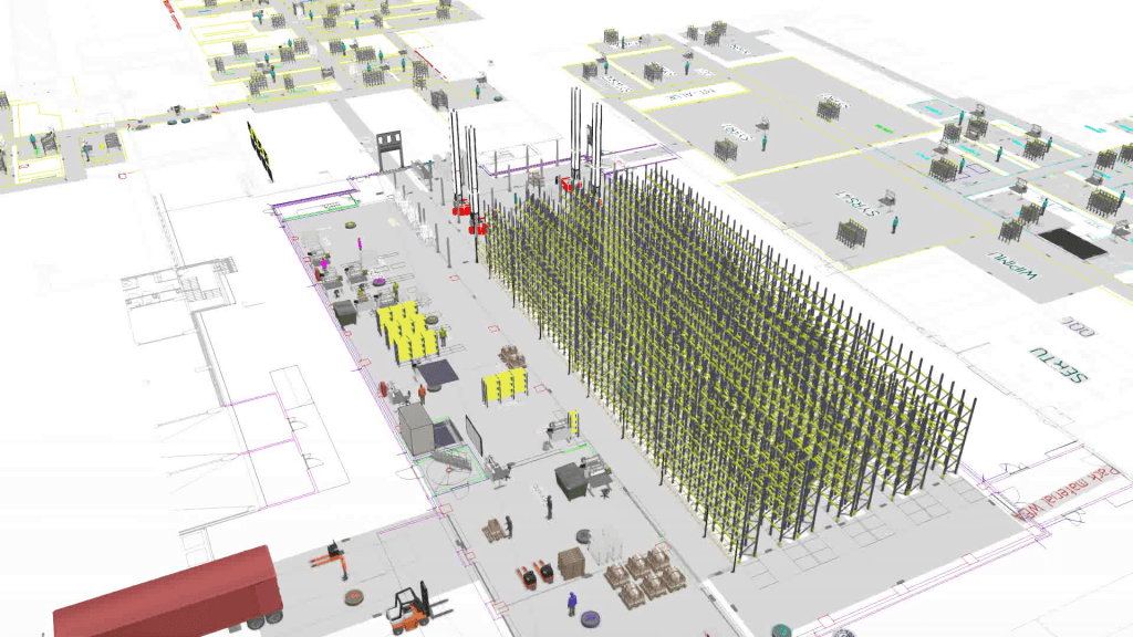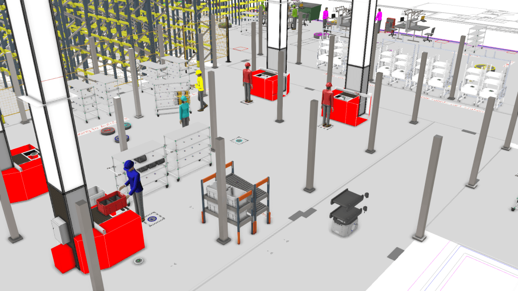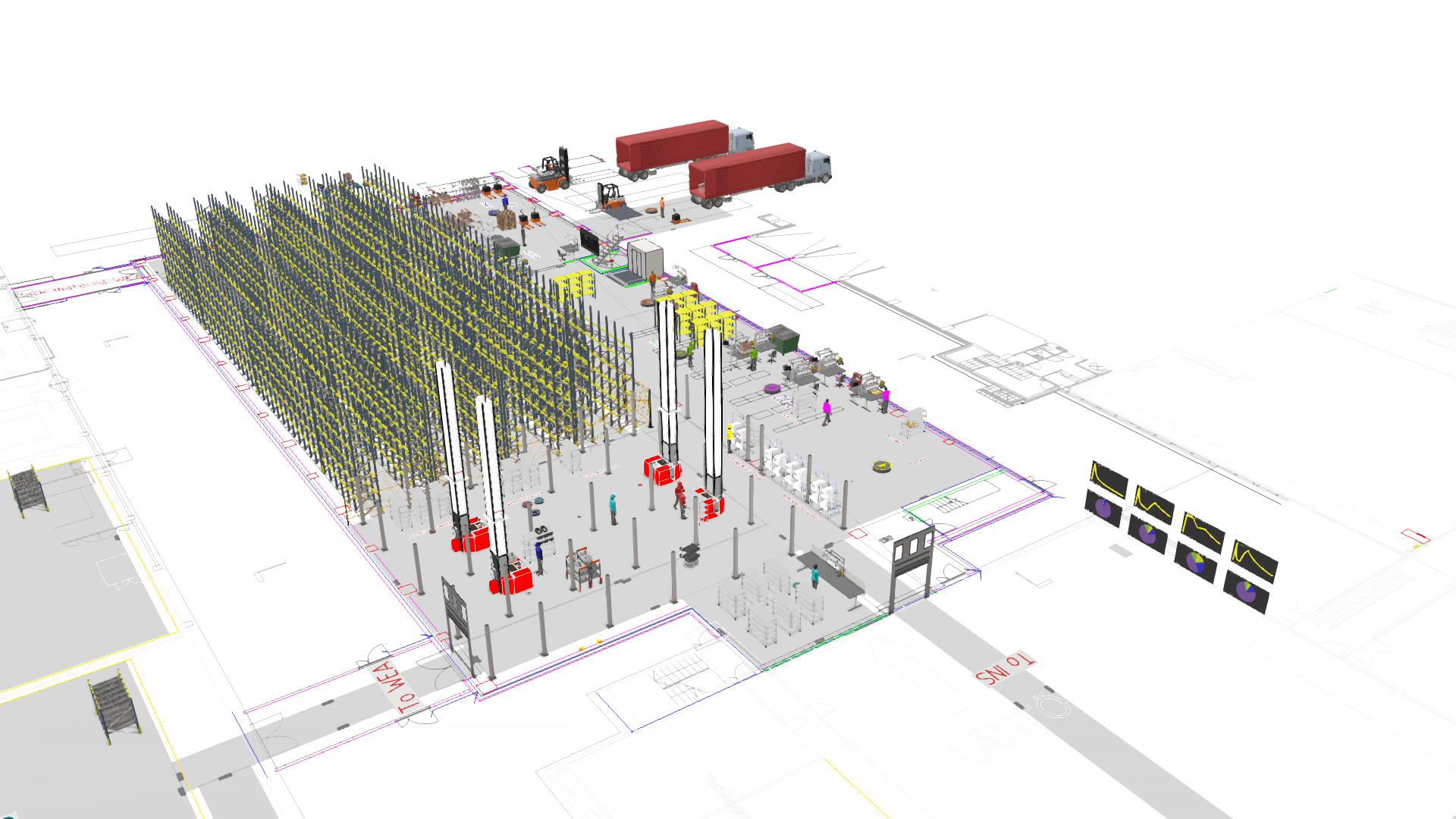 He decided then to model the entire facility in 3D. included all the planned equipment (picking carts, conveyors, AGVs, AutoStore ports) and connected it with real process data from their Enterprise Resource Planning (ERP) system.