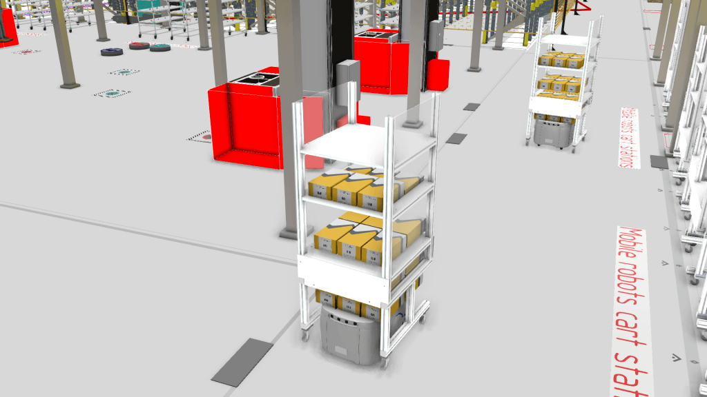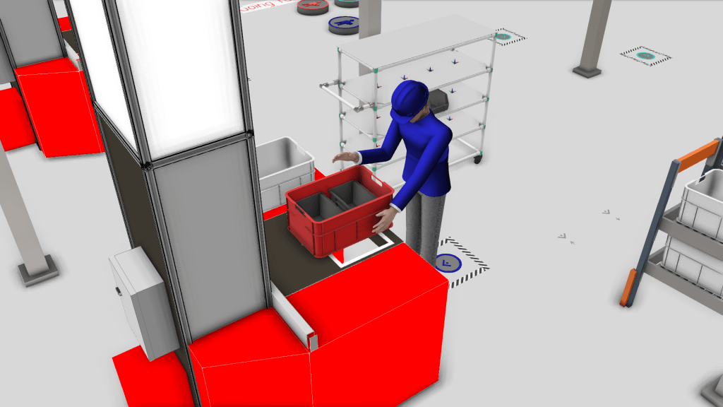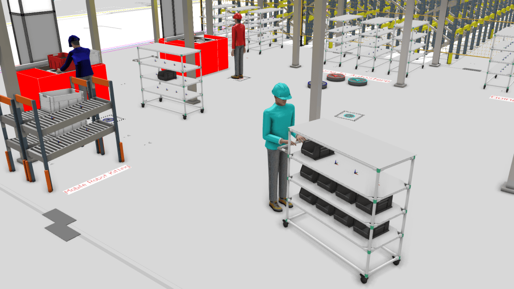 But with that many moving parts in a tight space, Vaisala’s team needed to be sure the system would work as intended. Would the mobile robots stay on schedule? Would the picking and repacking stations be overloaded? Would operators be able to move efficiently in the space? These questions couldn’t be easily answered in Excel or static CAD.