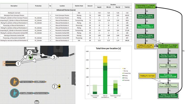 Create layouts and simulations in Visual Components from Excel data, flowcharts, or value stream inputs – using a guided workflow for quick setup and first analyses.