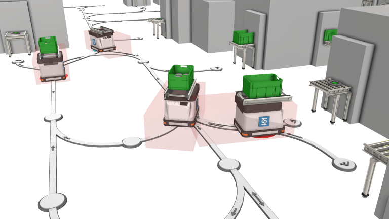 Plan and simulate AGV and AMR fleets in Visual Components with realistic fleet behavior, traffic logic, and dynamic intralogistics simulation.