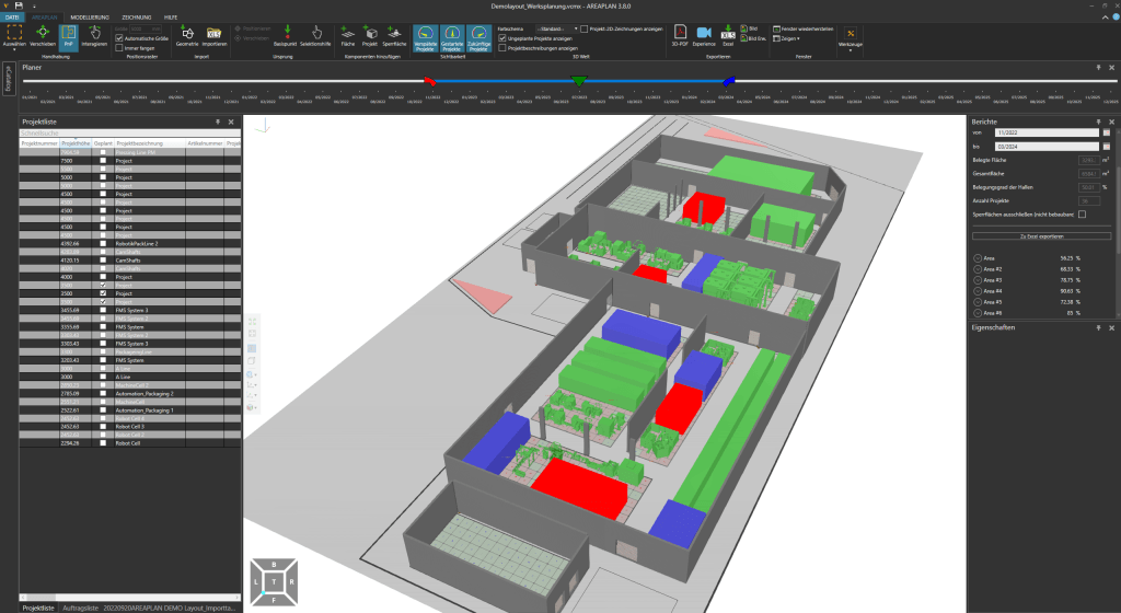 The DUALIS AREAPLAN add-on enables planners to visualize, allocate, and optimize hall space across projects and time, considering real-world constraints such as space availability, equipment dimensions, and building limitations. This provides clear insight for improving space utilization, avoiding conflicts, and supporting data-driven layout and assembly planning decisions.