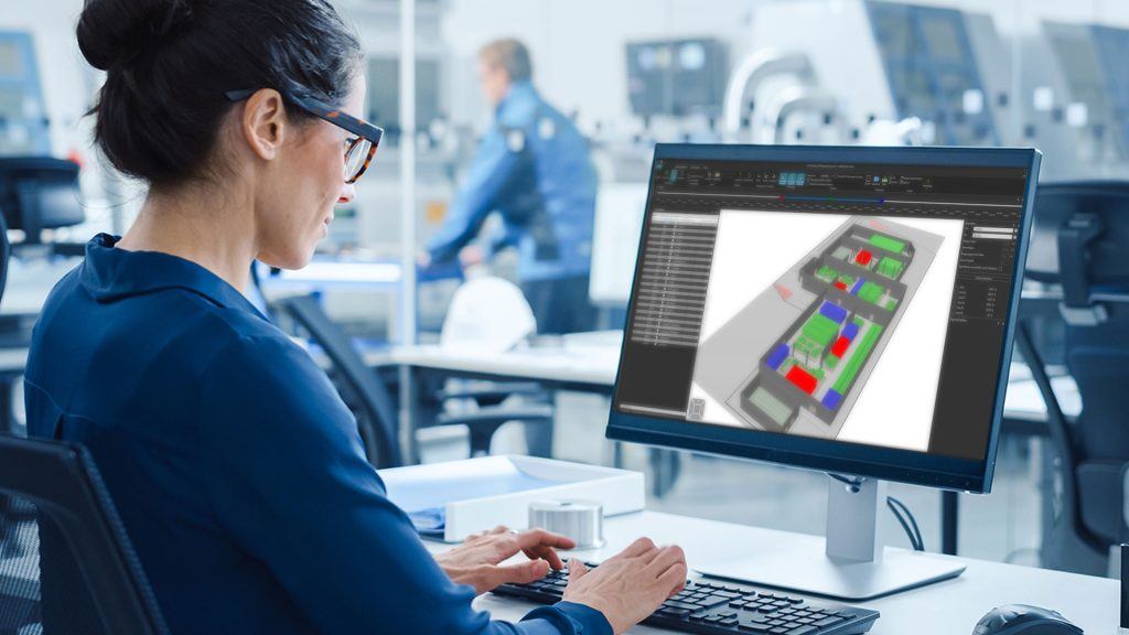 Plan and optimize assembly and production hall space in Visual Components using digital shop allocation, time-based planning, and 3D visualization of spatial constraints.