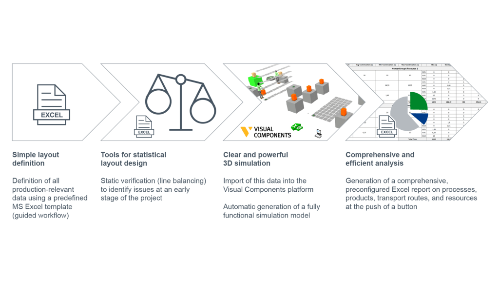 Create layouts and simulations in Visual Components from Excel data, flowcharts, or value stream inputs using a guided workflow for quick setup and first analyses.